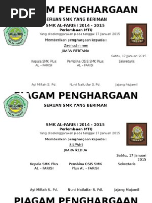 Related : Contoh Piagam Penghargaan Juara Mtq / Contoh piagam penghargaan perlombaan simple kehidupan sosial..