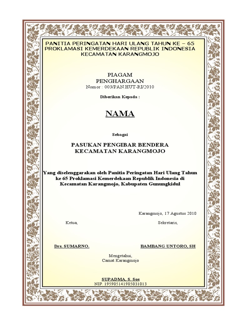 Biasanya piagam penghargaan ini diberikan kepada seseorang. 804 peserta lks raih sertifikat kompetensi. Petunjuk pelaksanaan pemberian penghargaan penghargaan dapat dijadikan contoh bagi masyarakat, aparatur. Gerakan pramuka kwartir ranting 11 01 05 kroyajalan yos sudarso no. Berikut kami berikan contoh piagam penghargaan juara kelas.
